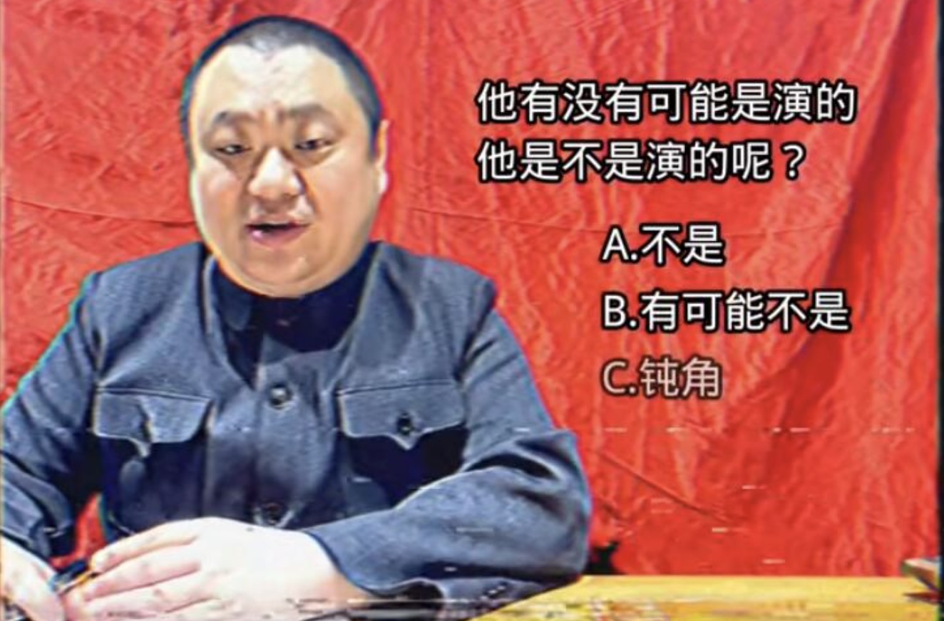 该梗出自B站up主艺能人金广发2021年11月14日发布的一 期视频《金广发.讲堂》第六课,视频中金广发依照当前网络中的流行语向网友们提出了三道题。其中第二题为“他有没有可能是演的,他是不是演的呢? A 不是 B 有可能不是 C 钝角”。