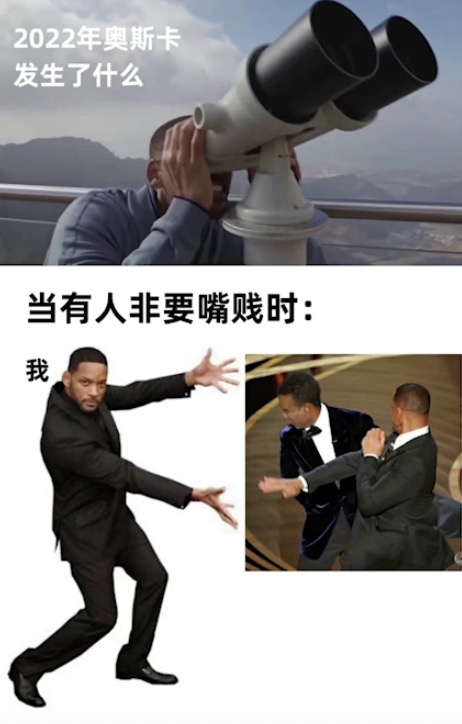可能有些人不认识他们,举个例子,大概情况就是小明作为颁奖嘉宾在舞台上调侃小红(即小强的妻子)。被小强冲上去干了一拳,然后小强坐到位置上说,别让我老婆的名字从你的狗嘴里说出来。随后,这件事情被做成了各种各样的梗图,如下~
